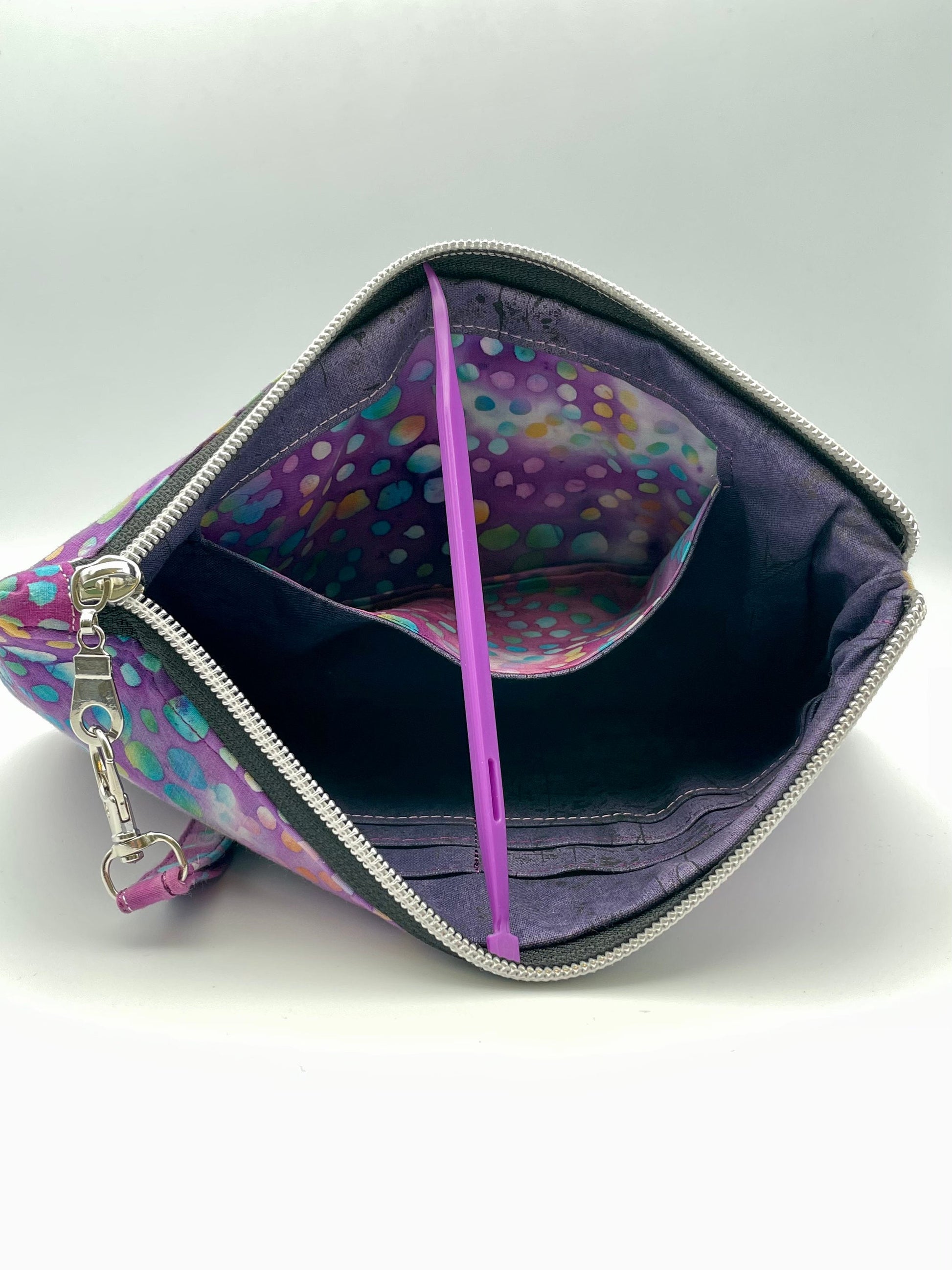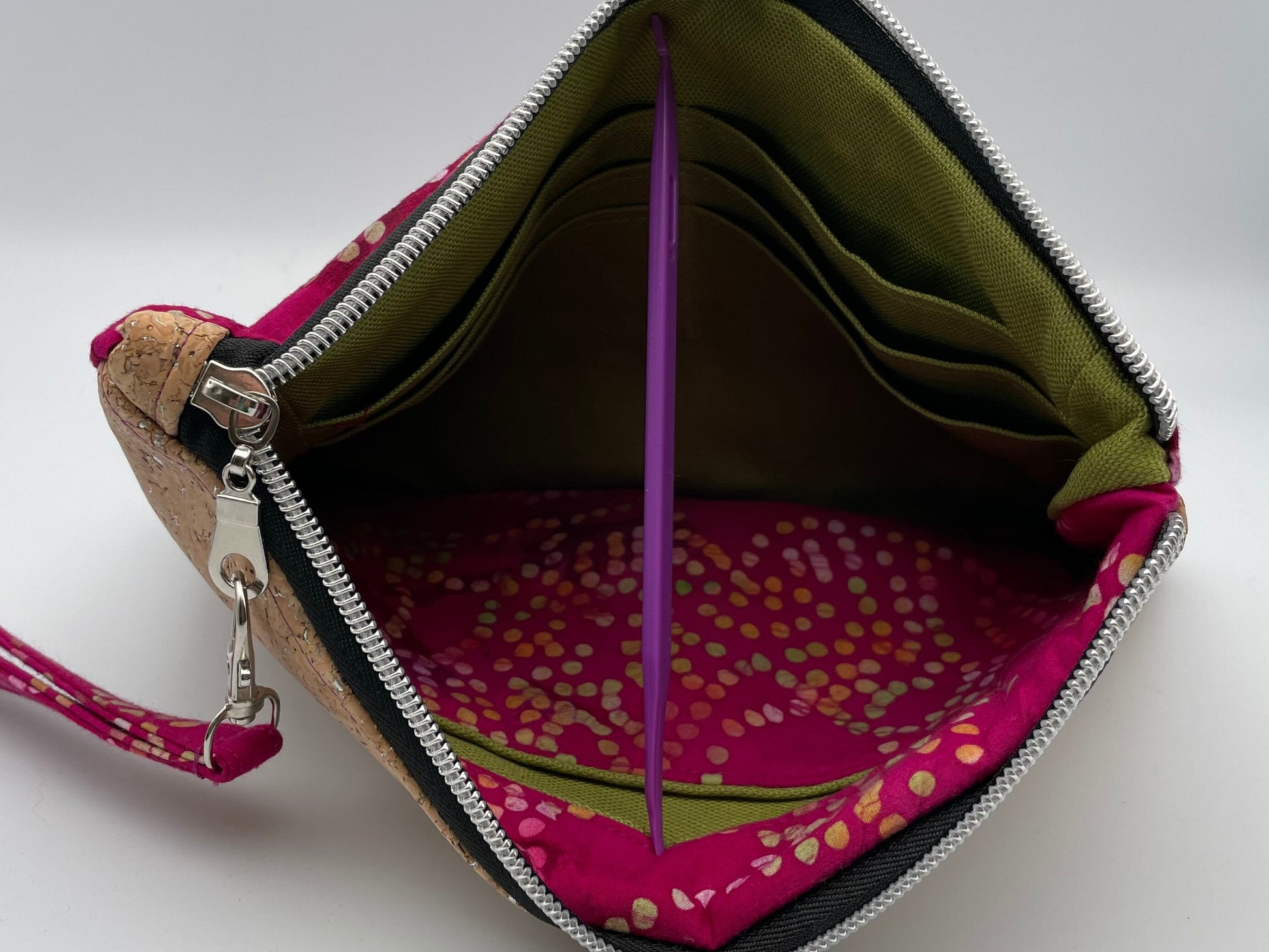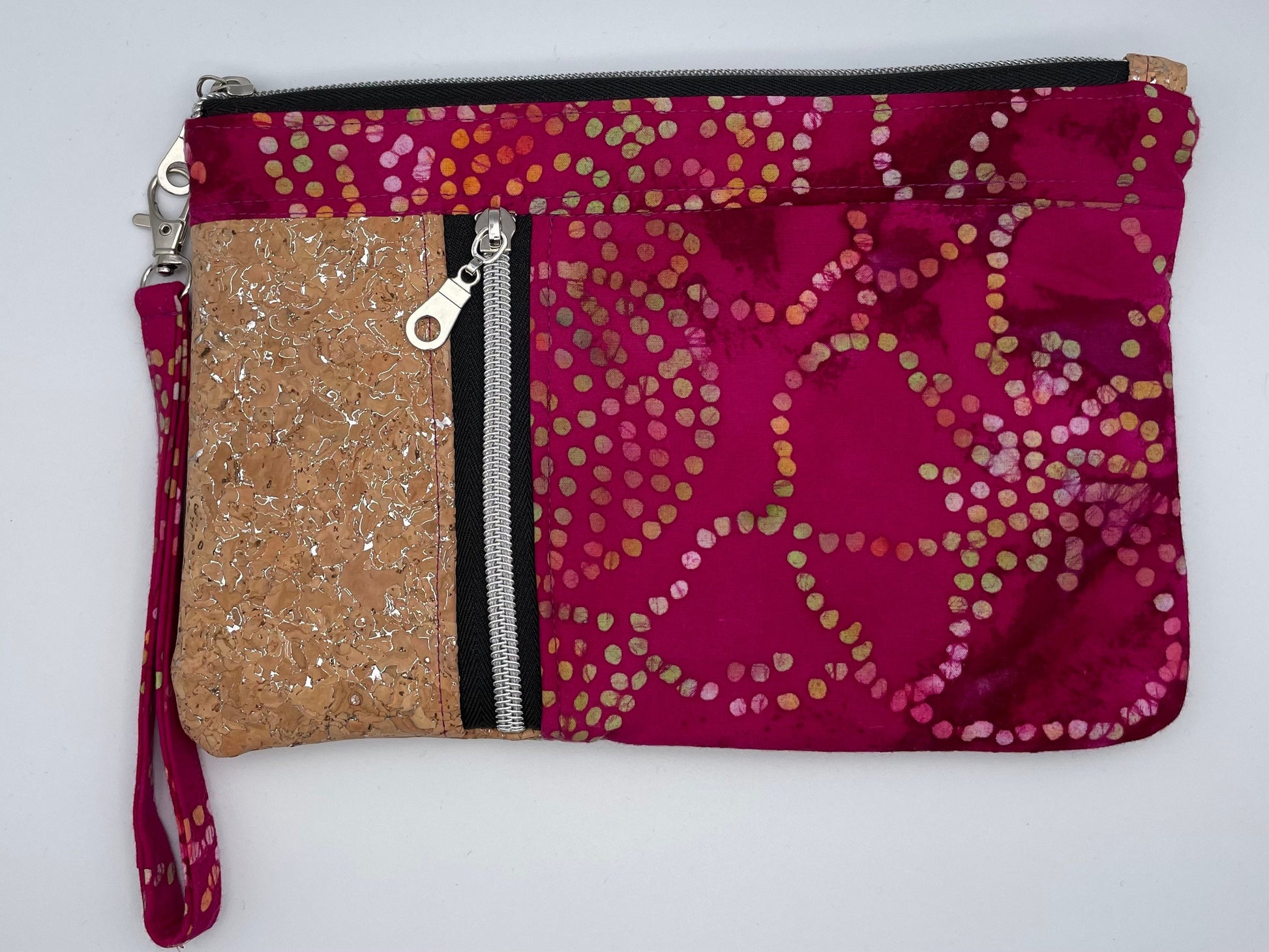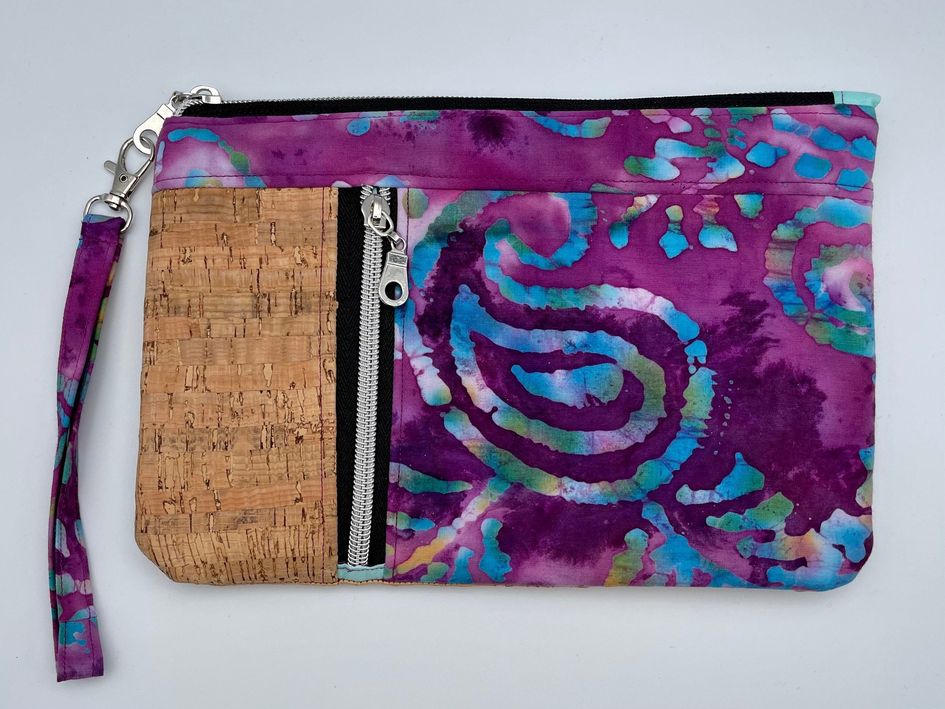 Made from Batik fabric and natural cork. Includes card slots inside to keep you organized.