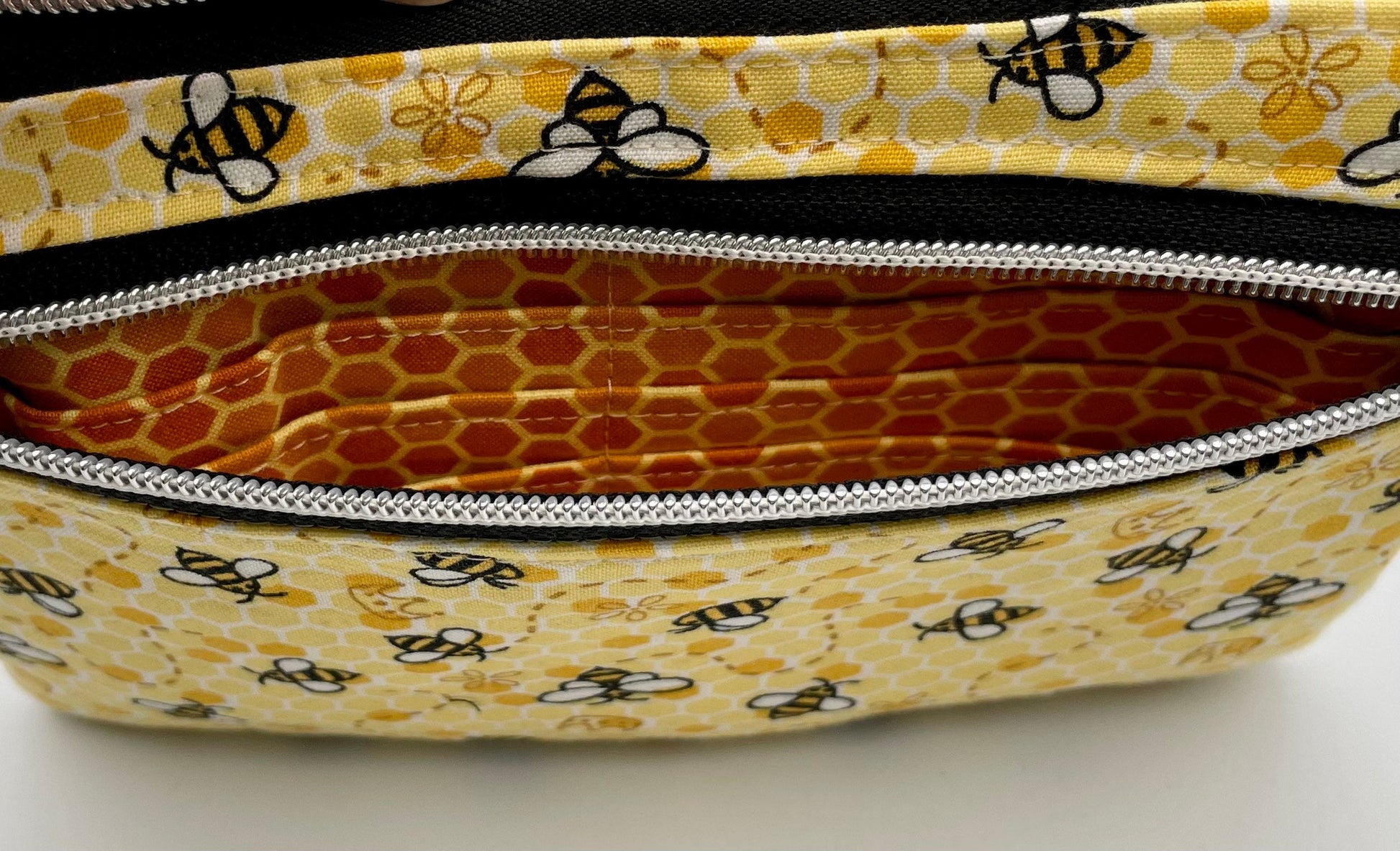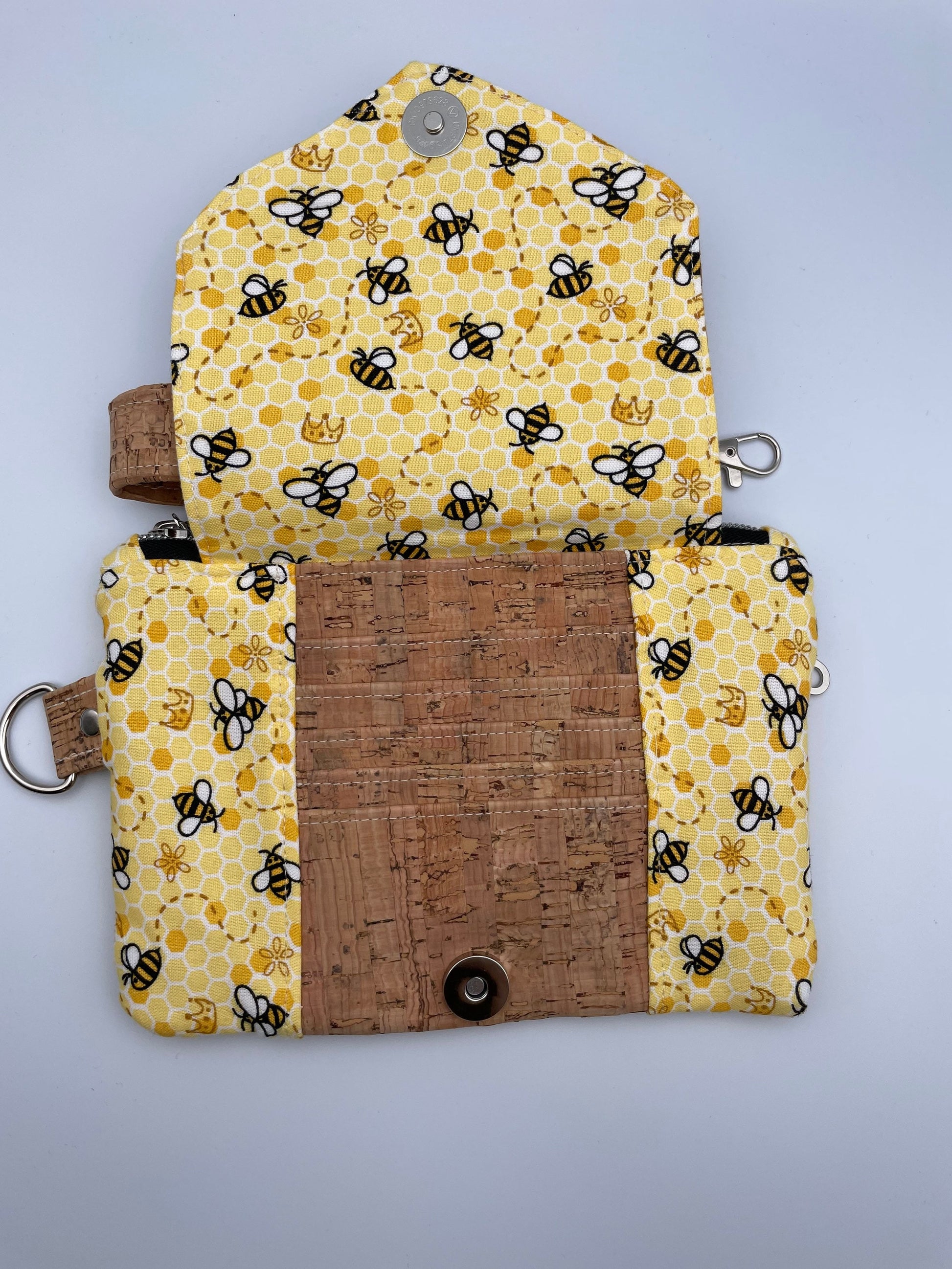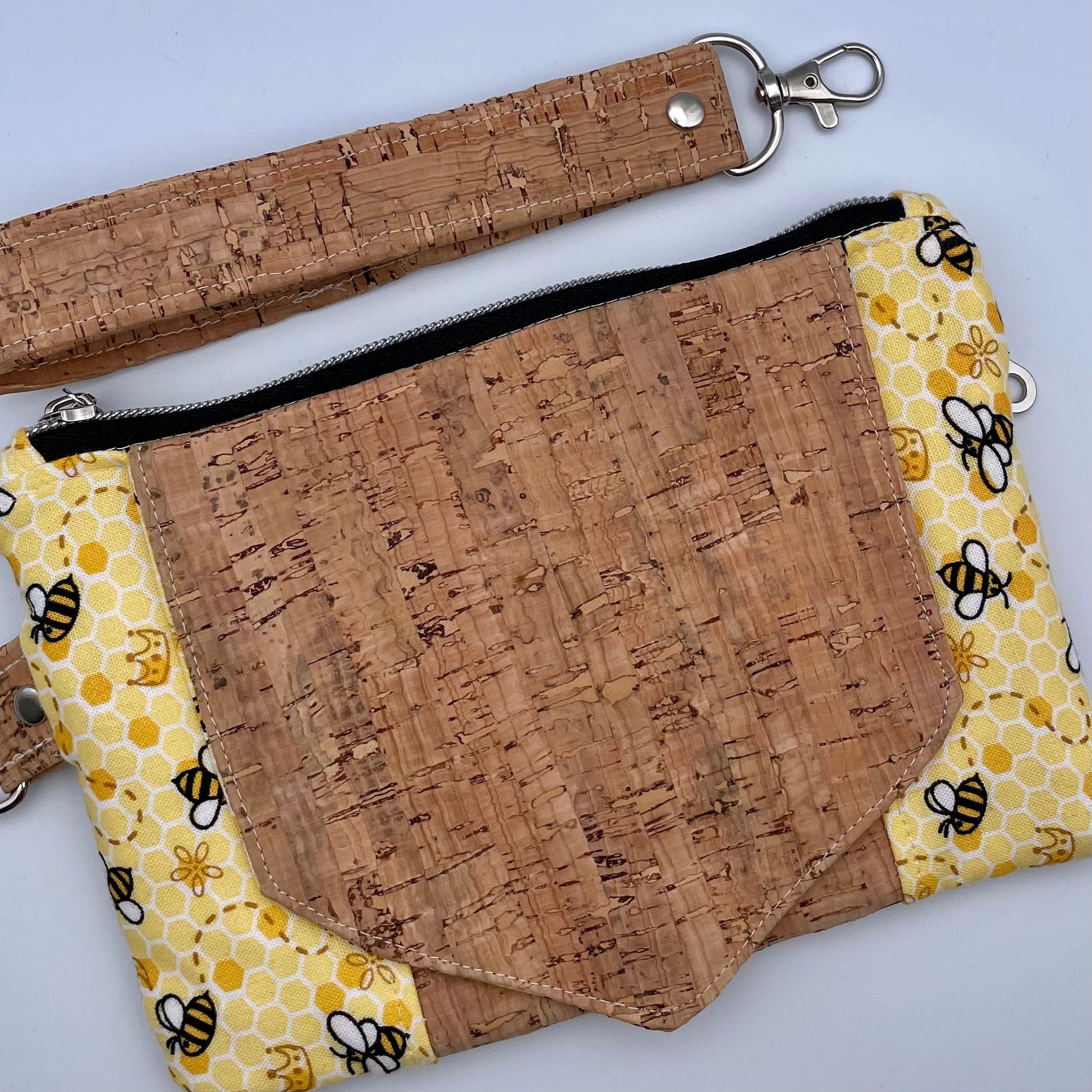Bees, honeycomb and cork make up this adorable wristlet wallet with a crazy amount of card slots! There are 5 in the front flap and another 6 hidden in the back zipper pocket!