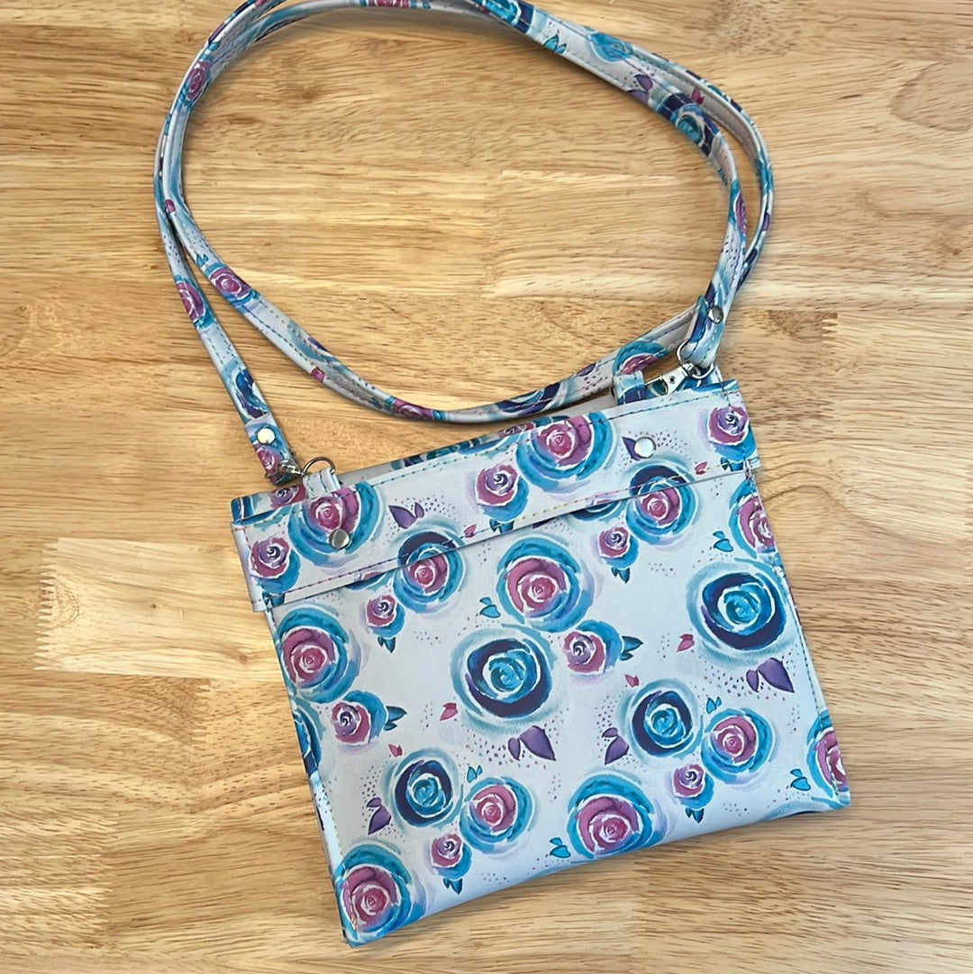 This flat bag is large enough for your essentials and will fit a large smartphone, money, keys and includes a tethered 4-card slot wallet. Measuring 8.5" W x 7.5" H, this includes a hand strap and crossbody strap so you can wear it as a crossbody, shoulder, waist bag or carry it as a clutch. With a custom designed print by Lauren Mormino, this is a durable bag for everyday wear. In artificial light, this bag has a white background, in the natural sun it turns into a beautiful purple color. Tim Holtz print completes the wallet and keyminder as well as the inside zipper pocket lining. this bag closes with a turn lock and has the optional V-flap design, by my friend, Elaine Honey.