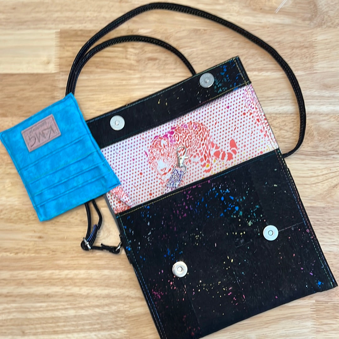 This flat bag is large enough for your essentials and will fit a large smartphone, money, keys and includes a tethered 8-card slot wallet. Measuring 8.5" W x 7.5" H, the includes a hand strap and crossbody strap so you can wear it as a crossbody, shoulder, waist bag or carry it as a clutch. With natural cork with rainbow flecks and Tula Pink's Mick Jaguar print lining, this is a beautifully colorful bag for everyday wear.