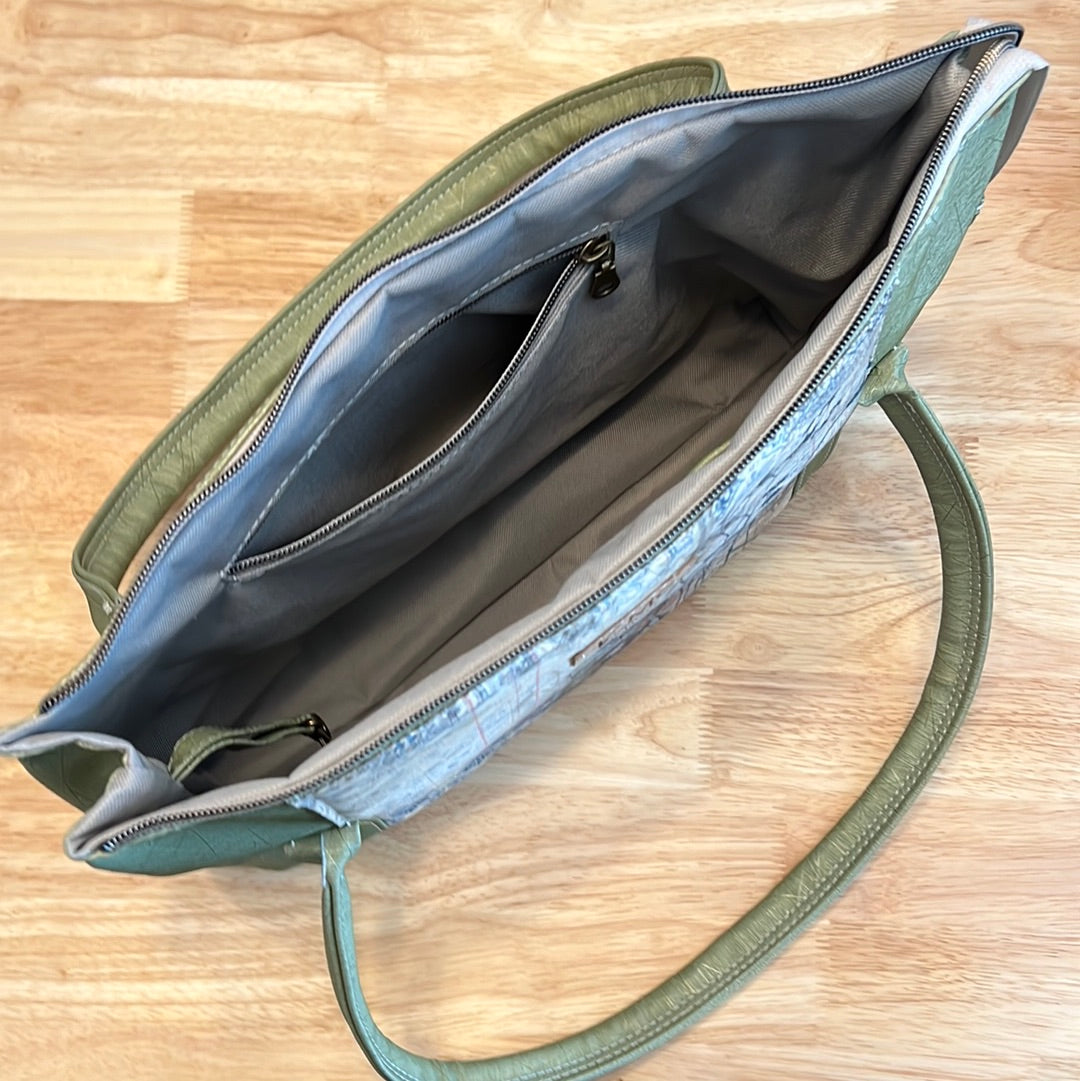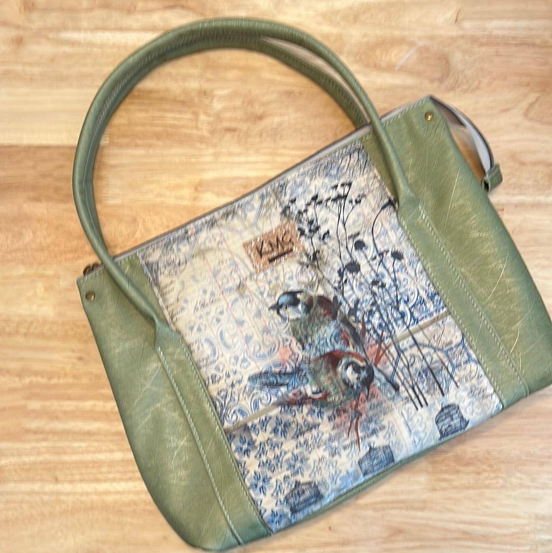 This bag measures 15" W x 10" H x 3" D and features a beautiful light green vinyl and bird cage print. With a top zippered closure, you will also find a zippered pocket split slip pocket and keyminder inside. Large enough for many laptops or tablets, this makes a great everyday office bag. The rolled handles allow the bag to sit just under your arm with a 7" drop from shoulder to the top of the bag. Antique brass zipper and rivets perfectly compliment this bag.