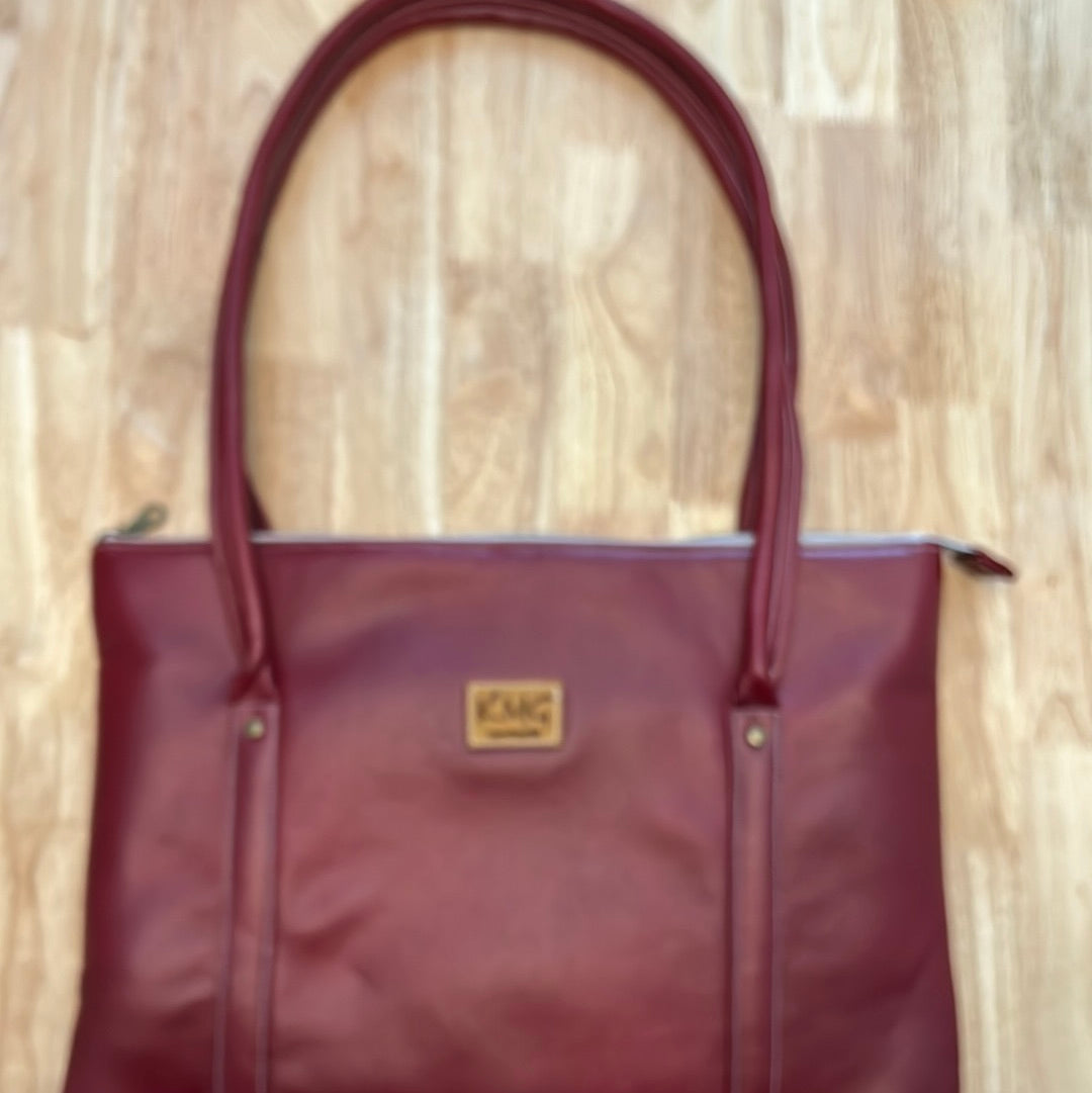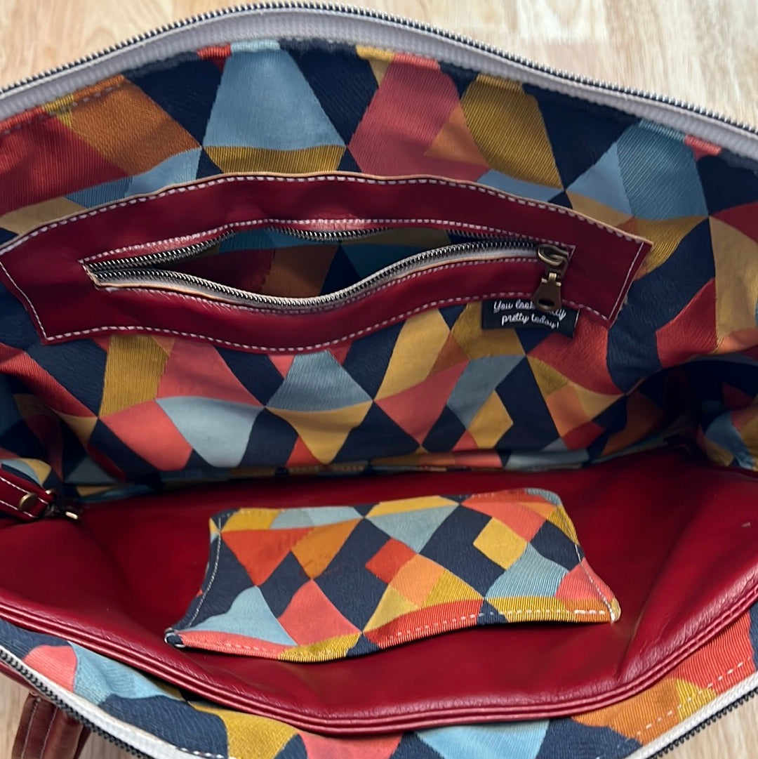 This 17" W x 12" H bag is made with red faux leather and upholstery fabric for a classic business bag look. It features a sleeve to pop over your wheelie bag when you travel. Inside you will find a 13" W x 10" H padded sleeve for a small laptop or large tablet. Also includes a slip pocket for your phone, zippered pocket with overlay and daily affirmation, and a keyminder so you always know where they are. Rolled handles with 13" drop and antique brass hardware finish this classic beauty.