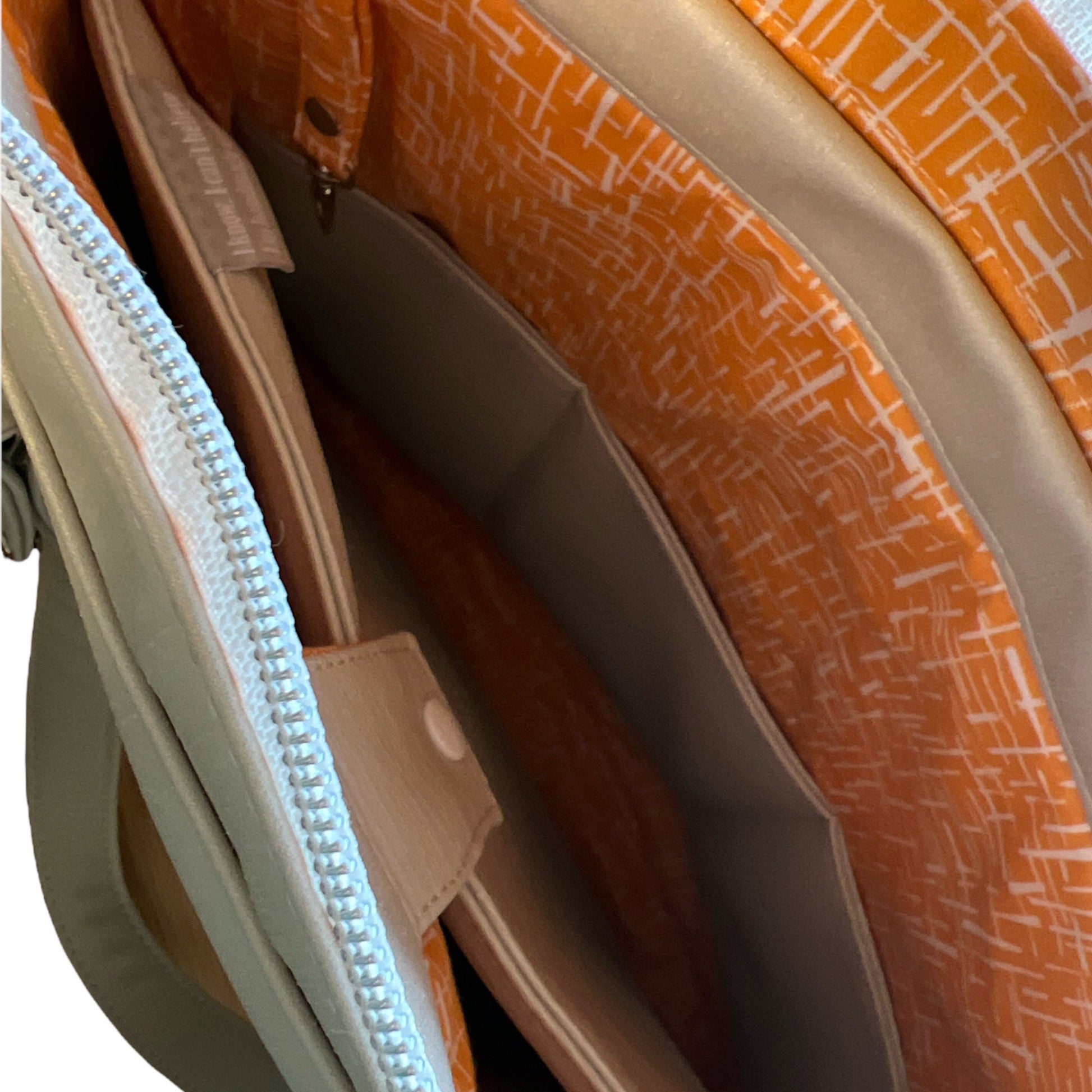 This listing is for one tote version of the Compass Business Bag, designed by me! Make with an ivory shantung vinyl exterior and nickel hardware, this tote has a classic style with a fun orange print inside to brighten your workday. The laptop sleeve under the recessed zipper will accommodate a device up to 14". A divided slip pocket is perfect to fit your peripherals or phone. Clip your keys to the keyminder so they do not get lost in the bottom of your bag. Full size Superpockets are on both sides of this bag to carry documents or whatever else you can think of. An 8.5" drop from top of handle to the top of the bag allows you to carry it snuggly under your arm.
