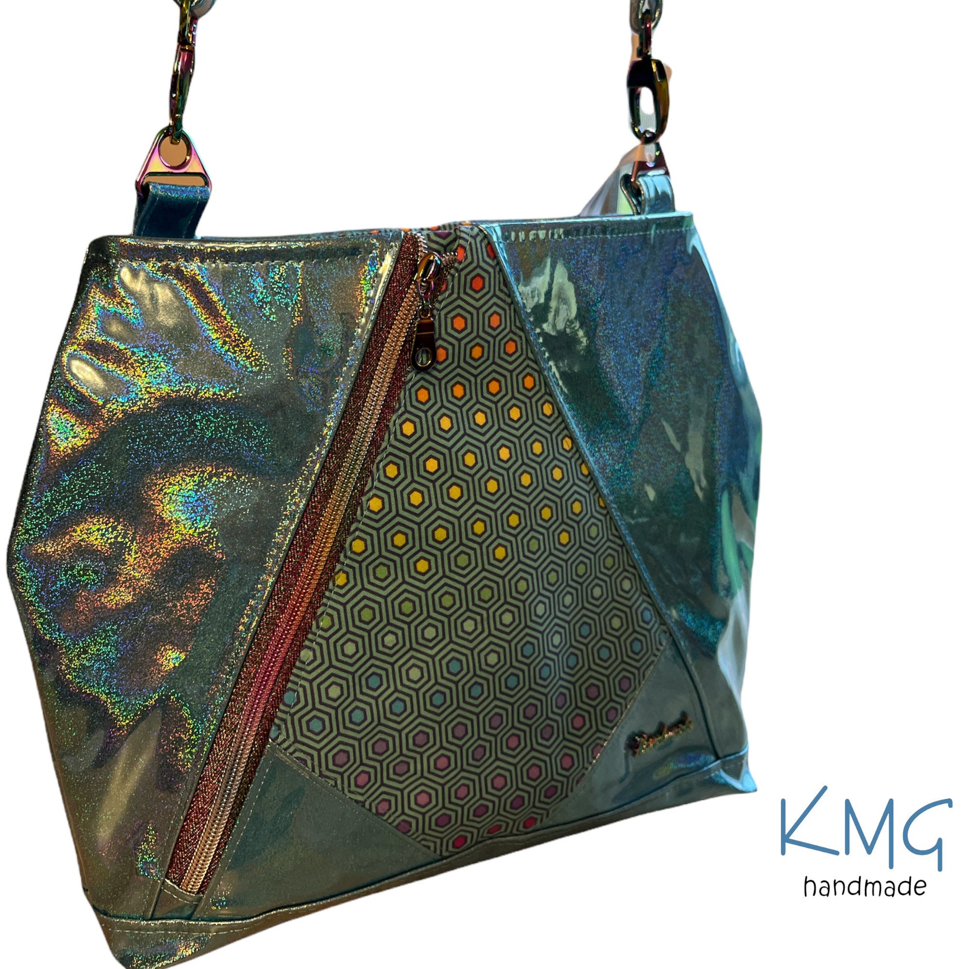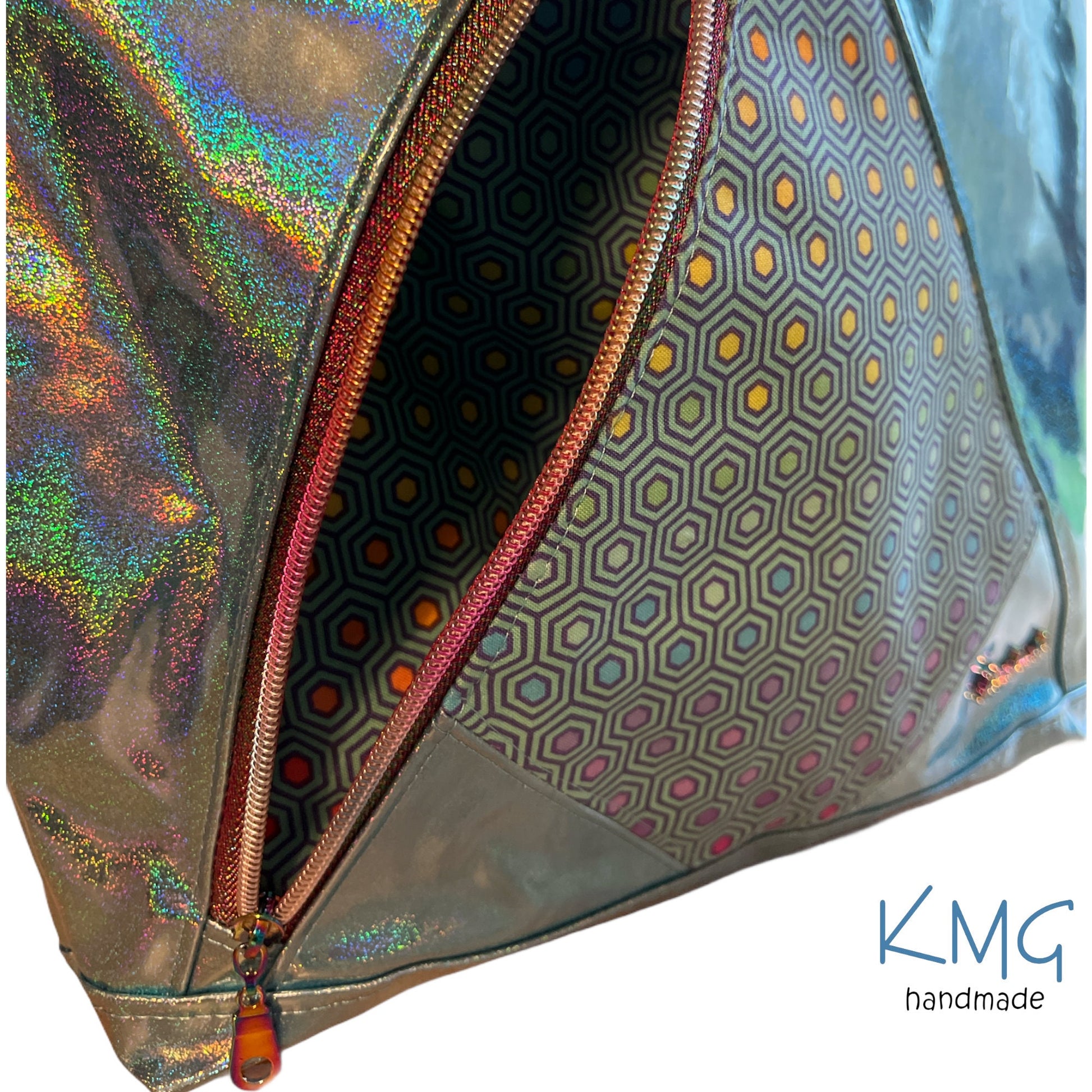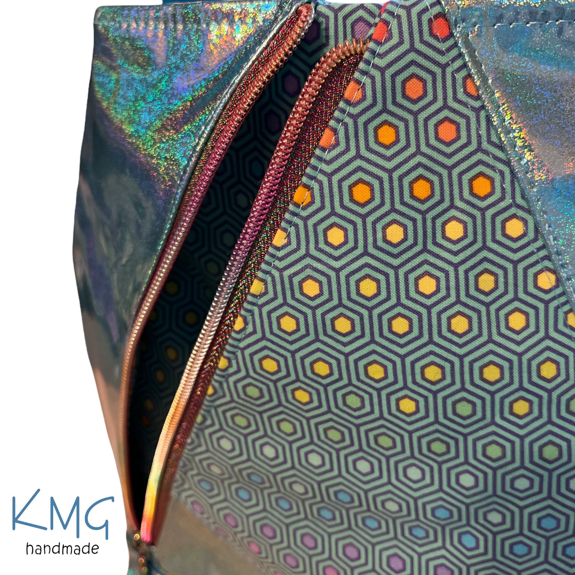 This listing is for one Compass Crossbody Bag, designed by me! This bag features an aqua iridescent vinyl and Tula Pink Hexy exterior with Superpockets on both sides. Rainbow zippers and hardware to coordinate perfectly. Inside, there is an aqua waterproof canvas liner with zipper pocket and divided slip pocket for pens, cell phone and water bottle.