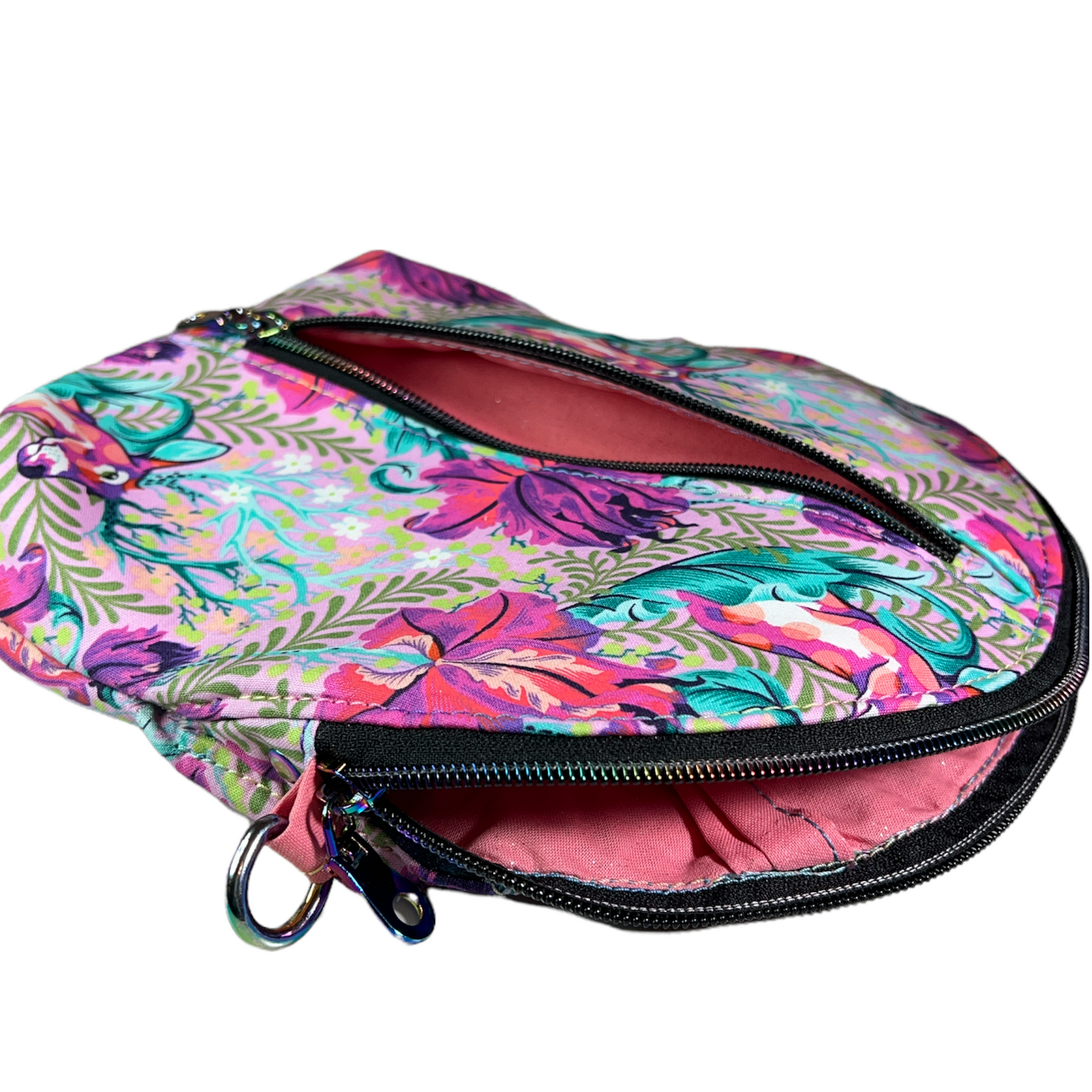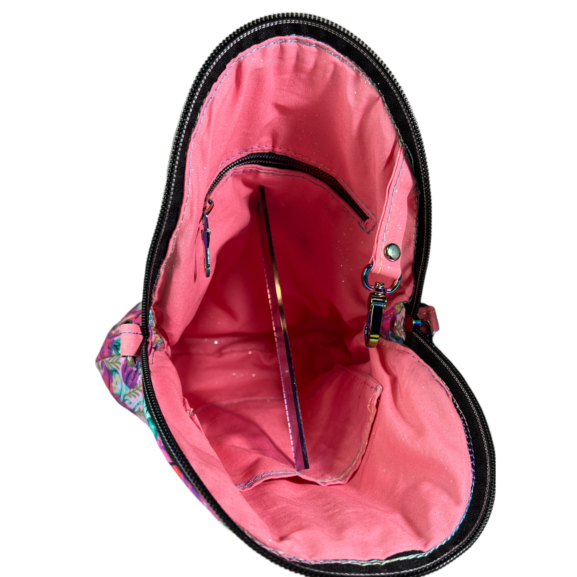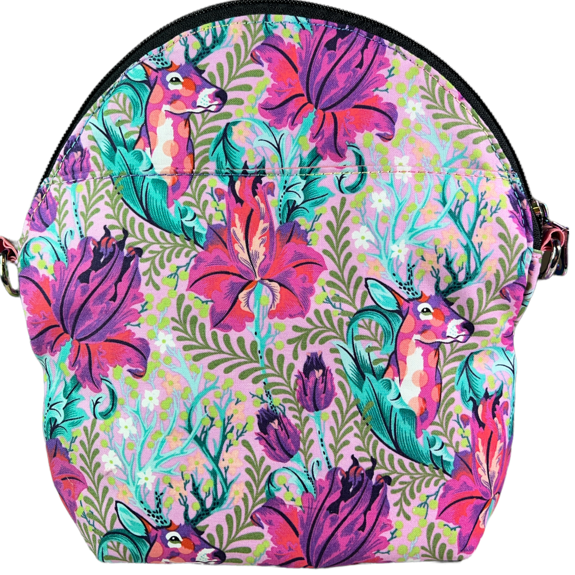 This bag is perfect for everyday use with all your essential gear. It opens up wide to access wallet, keys, sunglasses but also holds them securely in place with a zippered closure. The back has a magnetic closure slip pocket and the front has a vertical zippered pocket, large enough to carry a smartphone and a great place to feature custom zipper pulls or fussy cut fabric prints! The Wellington Wallet pattern is a perfect companion to this bag as it fits perfectly in the interior divided slip pocket to hold your cards and cash!