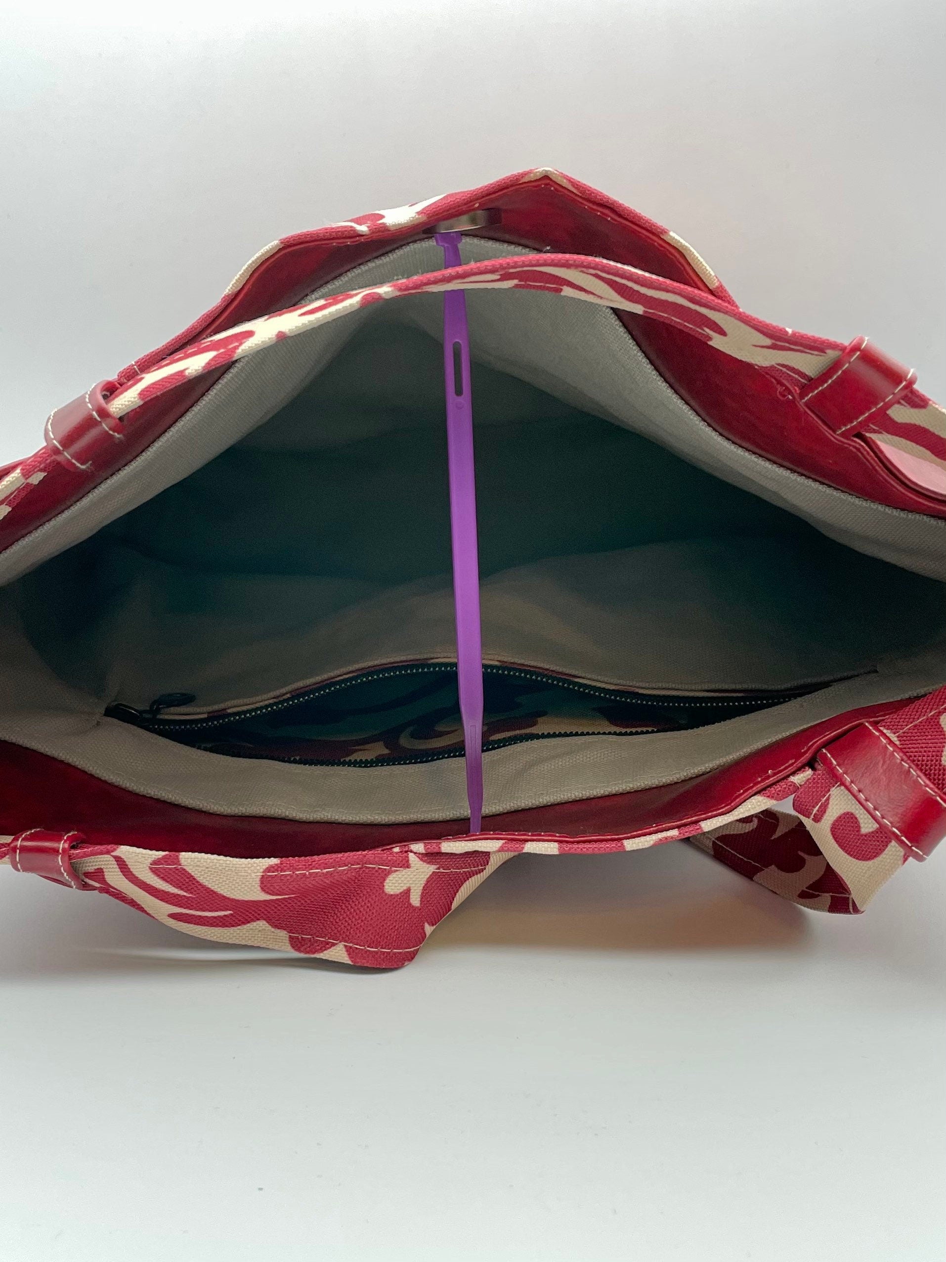 Red vinyl and floral waterproof canvas were used to create this pretty bucket backpack. Magnetic closure at the top and adjustable straps to pull it tight.
